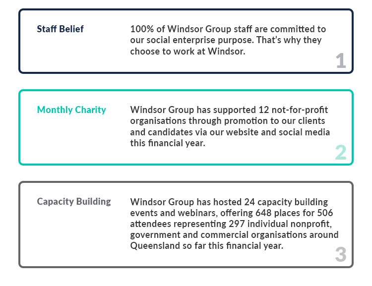 In May 2017, Windsor Group underwent an evaluation by Dr Lyn Alderman, Principal Evaluator. The purpose of this evaluation was to determine the extent to which Windsor Group achieved our ambition to re-invest profits into building the capacity of people and purpose-driven, socially-conscious organisations. A social enterprise is defined as an organisation that operates as a business with a significant focus on contributing to social good.